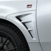 Ein markanter, einstellbarer Heckspoiler verbessert das Handling bei hohen Geschwindigkeiten und sorgt für sicheres Bremsverhalten. Der Winkel des Spoilers lässt sich manuell an unterschiedliche Bedingungen anpassen, sodass der GR Yaris sowohl auf der Rennstrecke als auch auf öffentlichen Straßen seine Stärken ausspielen kann. Eine überarbeitete Unterbodenverkleidung optimiert den Luftstrom an der Fahrzeugunterseite. Neue Luftkanäle an den Kotflügeln zwischen Vorderrädern und Türen leiten die Luft aus den Radkästen nach hinten ab.